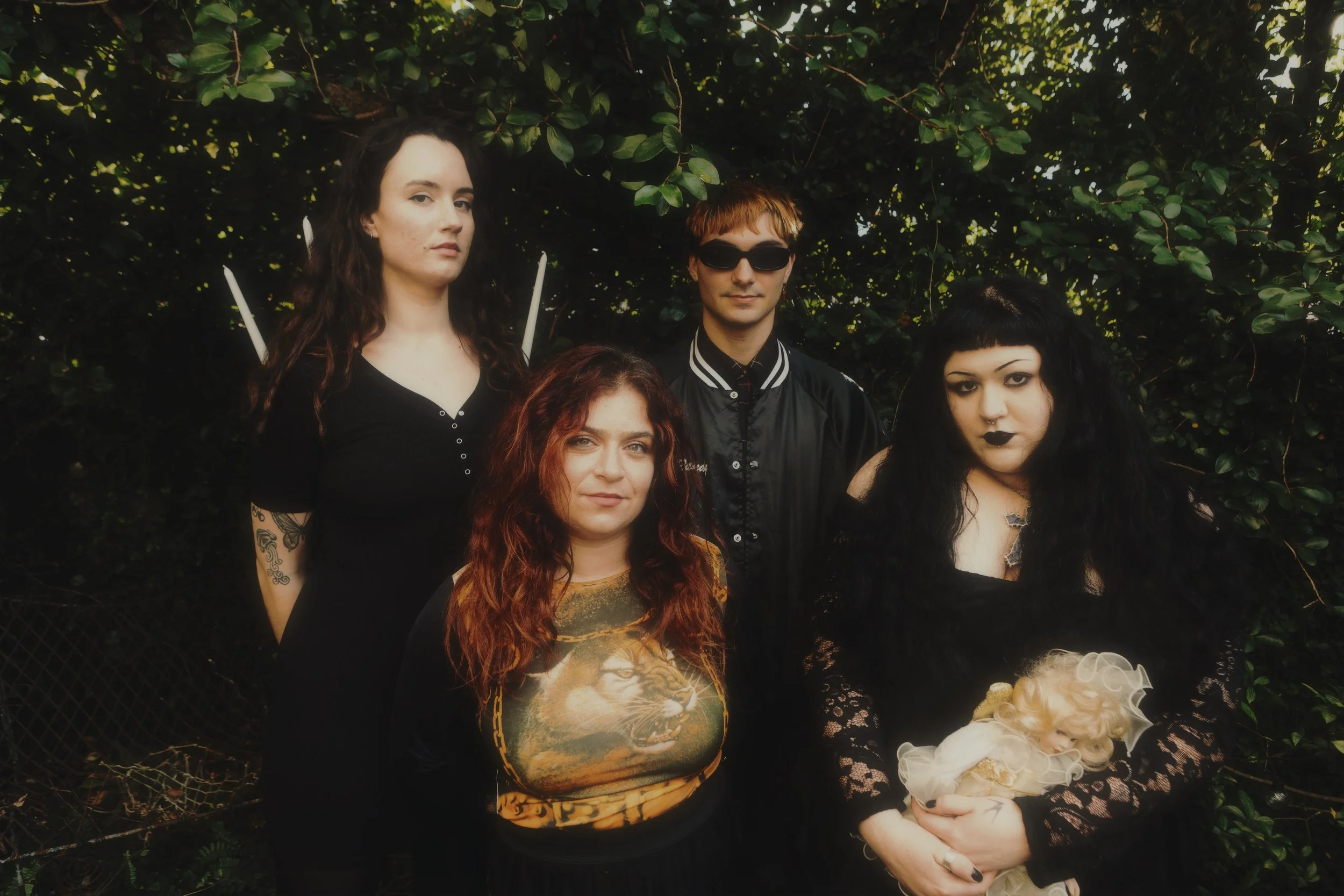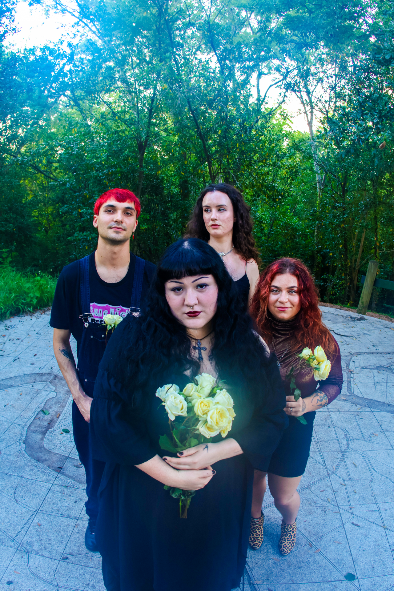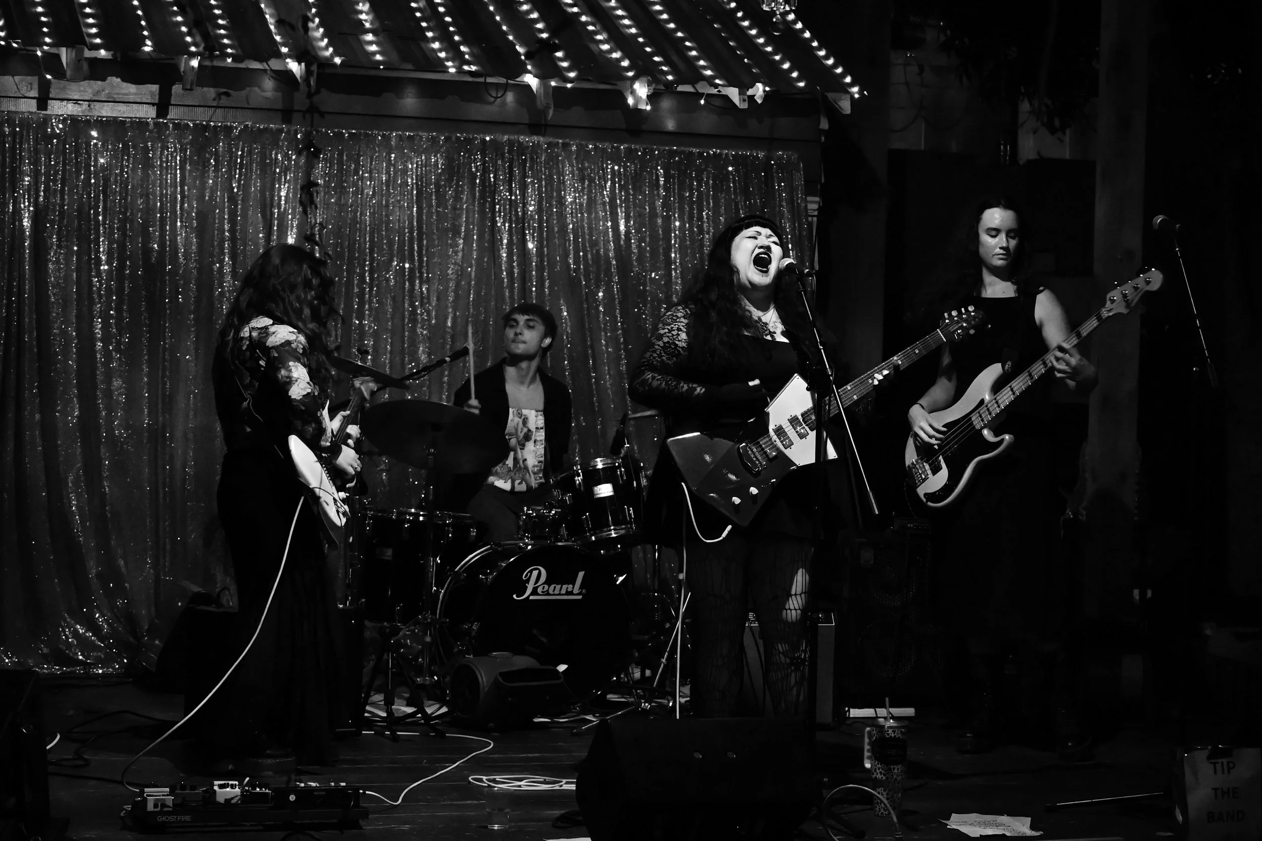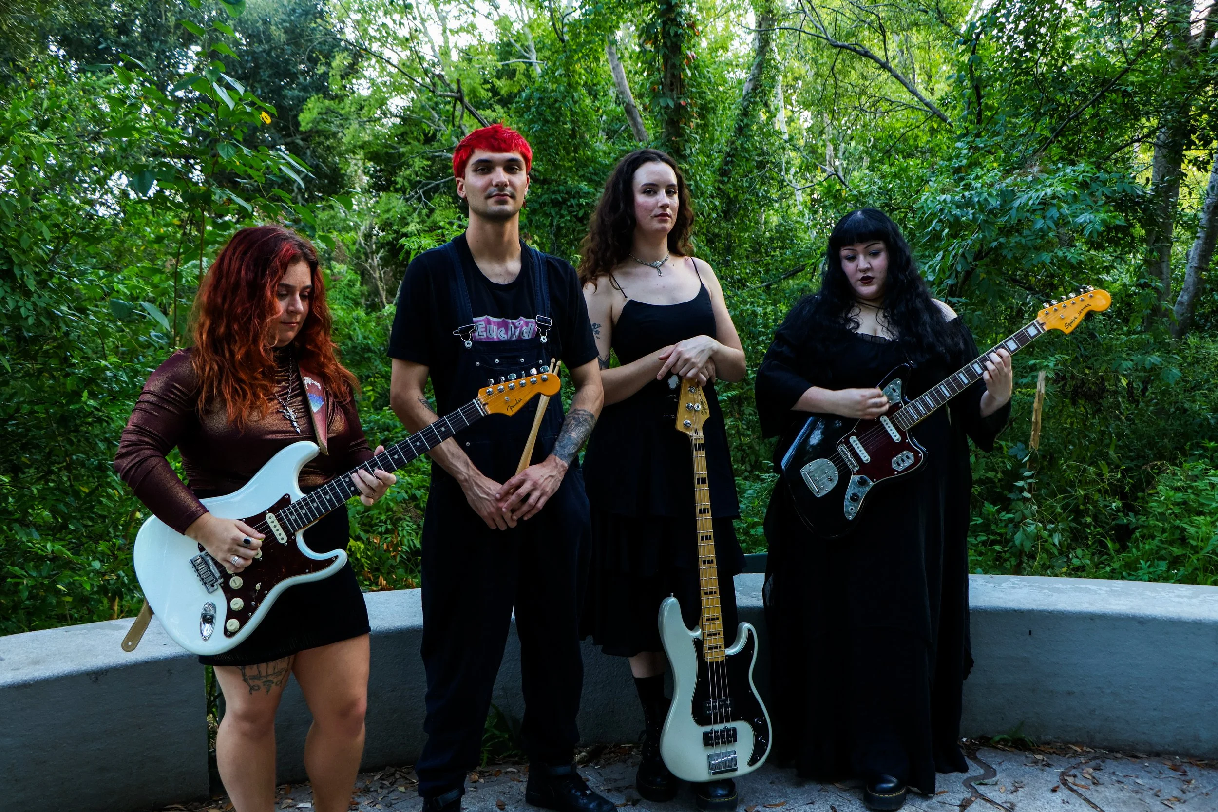 Emerging from the New Orleans underground, the four-piece “glitter grunge” group Swinging Astrid is currently making waves in the Gulf South alternative scene. Composed of drummer Rob Florence (he/him), lead guitarist Jess Araten (she/her), bassist Clover (she/they), and lead vocalist/rhythm guitarist Madeline Usher (she/they), the band fuses grunge, shoegaze, and alternative rock into something that’s equal parts volcanic, tender, and visceral.